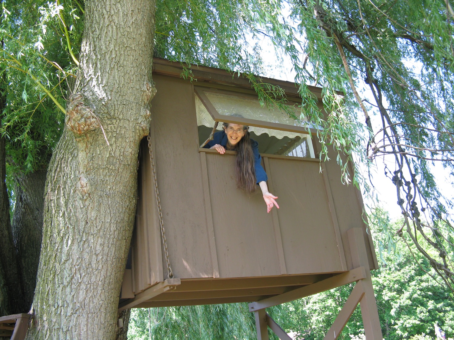 One of the things I discovered that first Spring we were together, was that Helen loved to climb trees. We'd go for a walk in the woods and as soon as she saw a tree with a low first branch, she'd take off her shoes and begin climbing. We joked that she had prehensile feet and toes, with which she seemed able to grasp any branch and stay balanced on it. I, on the other hand, had never climbed trees. Raised by parents who had lost so much during the Holocaust, my brother and I were hovered over to make sure we never did anything where we could hurt ourselves. San did climb a tree once when he was ten years old — and fell out of it, breaking his elbow. That was that for tree climbing. Even with Helen's playful encouragement and the emboldening effects of love, I usually only managed to climb into the lowest branches of a tree. Meanwhile, Helen would climb 20-30 feet into the air without any signs of hesitation or fear.