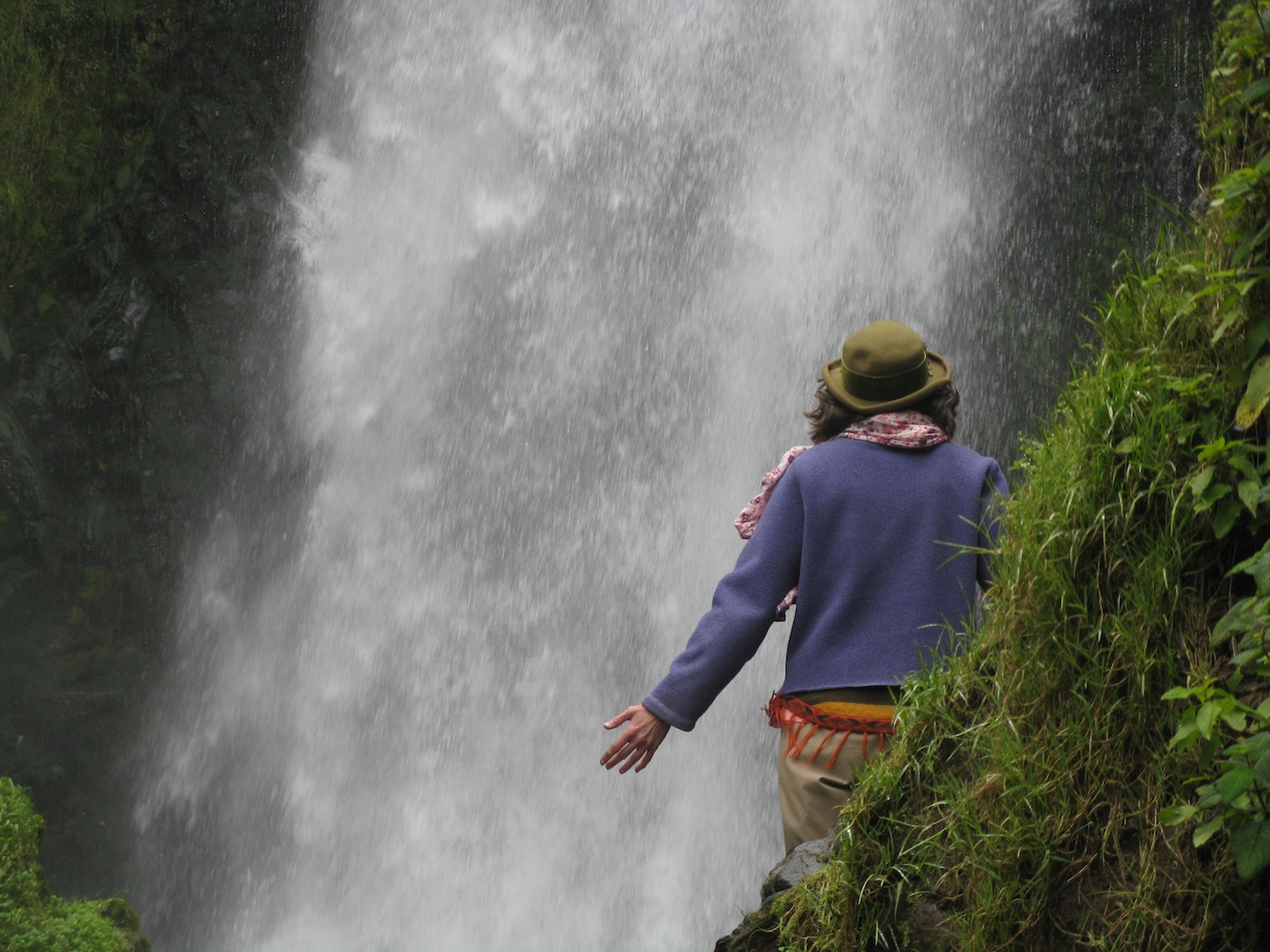 Last month I wrote about how she loved to climb trees, and how unafraid and sure- footed she was. Let me tell you a related story. A year and a half ago we were in Ecuador, visiting indigenous musician friends. Near where they live is an amazing place that people come from all over to visit — the waterfall at Peguche. There are steps carved into the cliff along both sides of the waterfall, with several observation booths where you can get quite close to the falling water. But if you're daring and fearless, you can approach the waterfall head on where there are large rocks jutting up from the rapids below. Guess where Helen went! I took these photos from a safe, dry place by the side of the river, while Helen climbed barefoot onto the spray-soaked rocks to commune directly with the waterfall. She wasn't being reckless or foolhardy — she respected, but at the same time trusted Nature and her connection to it.